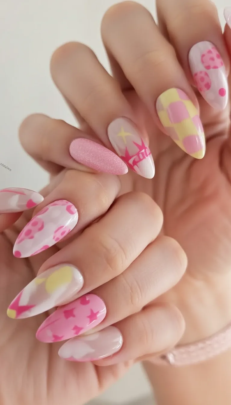 This set is ideal if you love gel ideas that make a statement. It works well on medium almond shapes and suits anyone who enjoys mixing solid colors with designs. Pair it with minimal jewelry and let the nails be the star. It’s inspo that feels fun, expressive, and unapologetically joyful.