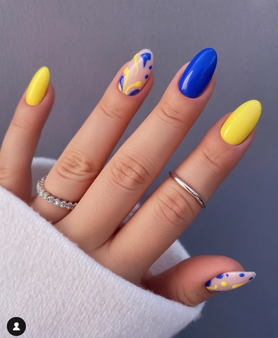 This combination feels like pure sunshine. The contrast between bright yellow and deep blue is eye-catching without being chaotic, and the playful abstract accent keeps things interesting. It’s the kind of manicure that instantly boosts your mood—no vacation required.