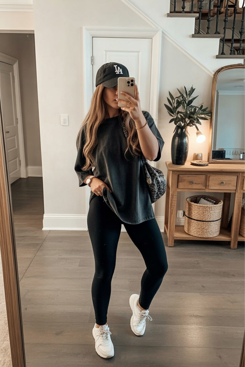 This is one of those outfits that feels like an old friend—you know it works, and you always feel good in it. The relaxed tee paired with leggings creates an effortless silhouette that feels modern without trying too hard. It’s casual, comfortable, and quietly confident.