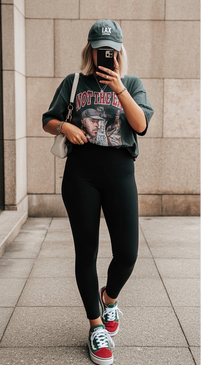 The vibe here is relaxed but intentional. Black leggings are a staple for a reason—they’re flattering, versatile, and easy to style for work-from-home days or casual outings. The oversized tee adds comfort and balance, making this a solid choice for midsize and plus-size wardrobes in 2026.