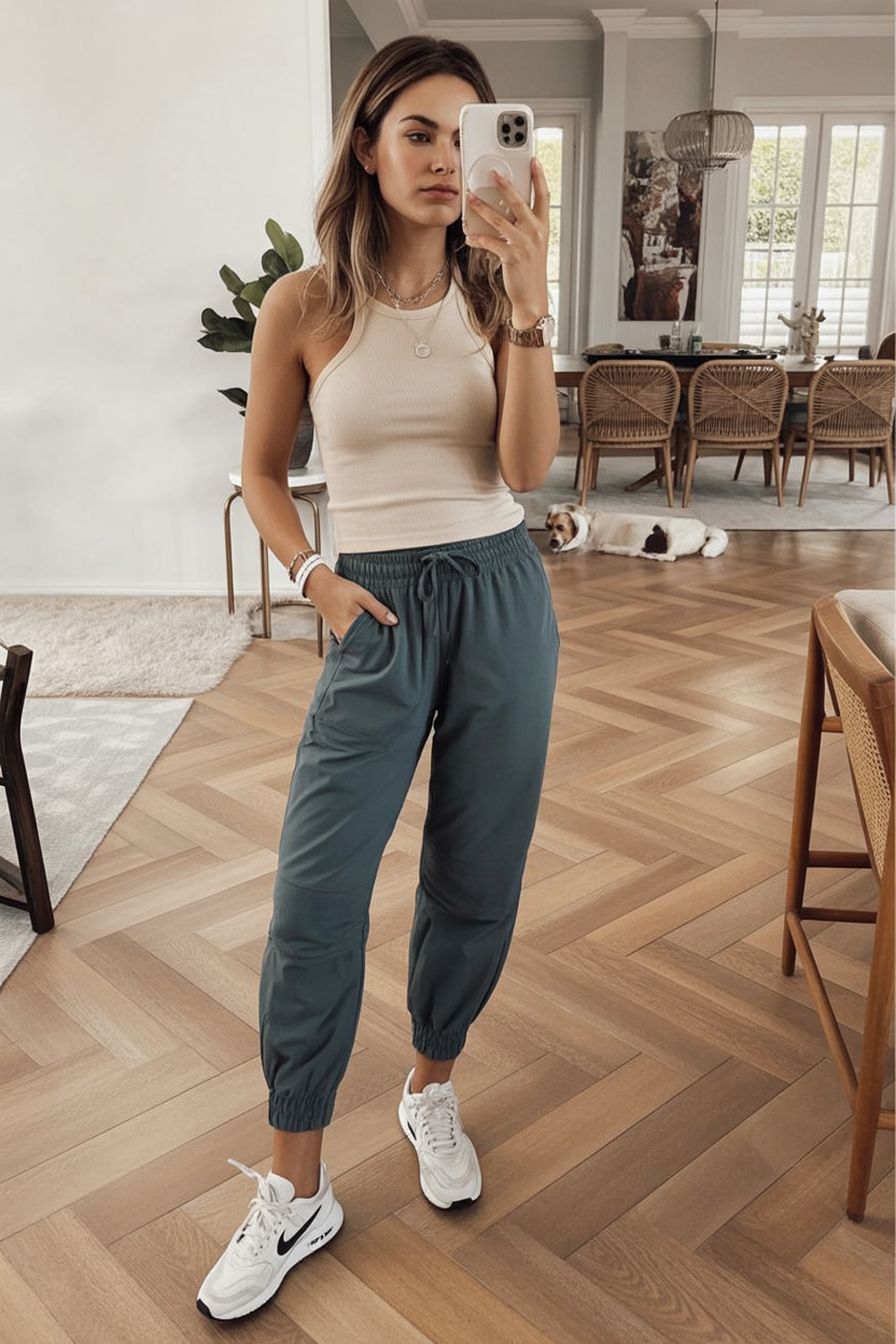 What makes this look special is how versatile the pants are. These jogger-style pants work for so many body types, including plus-size and curvy figures, because they skim rather than cling. You can dress them up slightly for work-from-home days or keep them relaxed with sneakers for everyday wear. It’s one of those outfits that earns its place in your 2026 rotation.