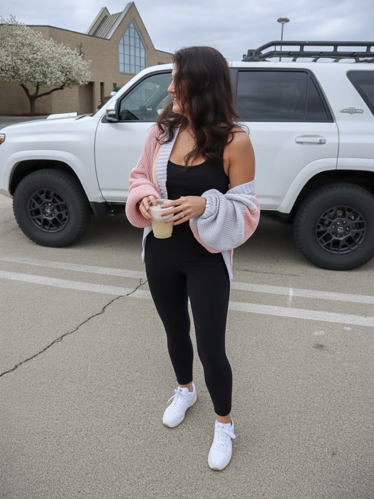 This outfit has that effortlessly polished feel that works almost anywhere. The black base keeps it classic, while the soft cardigan adds personality and warmth. It feels cozy but put together, which is exactly what spring athleisure should be.
