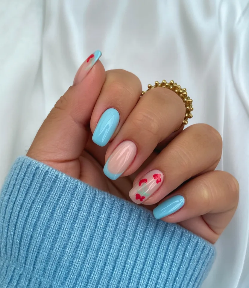 If you’re looking for something Fun but still wearable, this is such a smart choice. The square shape keeps the design crisp and modern, and the blue shade flatters cool and neutral undertones beautifully. It works especially well on medium to long nails where the cherry designs have space to shine. Pair it with denim, white shirts, or even a bold red lip for a cohesive 2026 ideas moment.