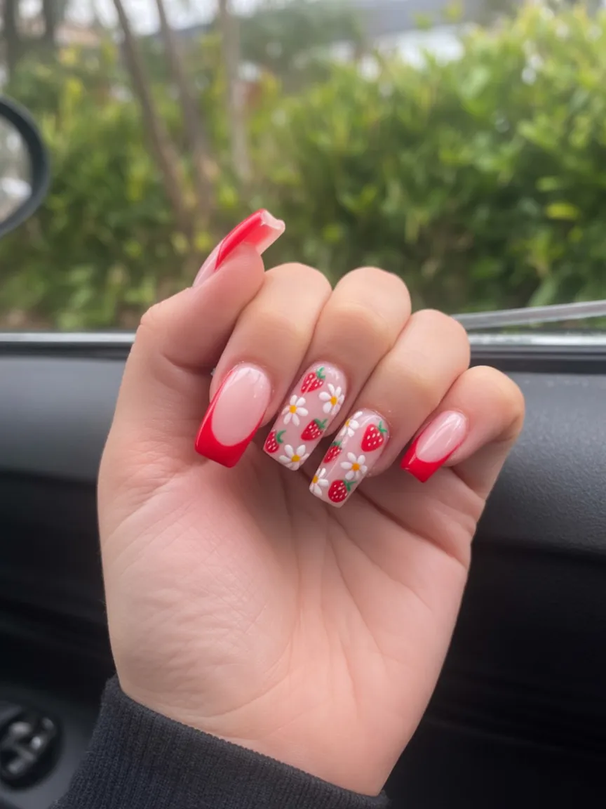 These strawberry accents instantly bring that sweet, sun-drenched summer vibe. The red French tips combined with tiny fruit designs feel joyful and unapologetically Fun. It’s playful, yes, but the square structure keeps it polished and modern for 2026.