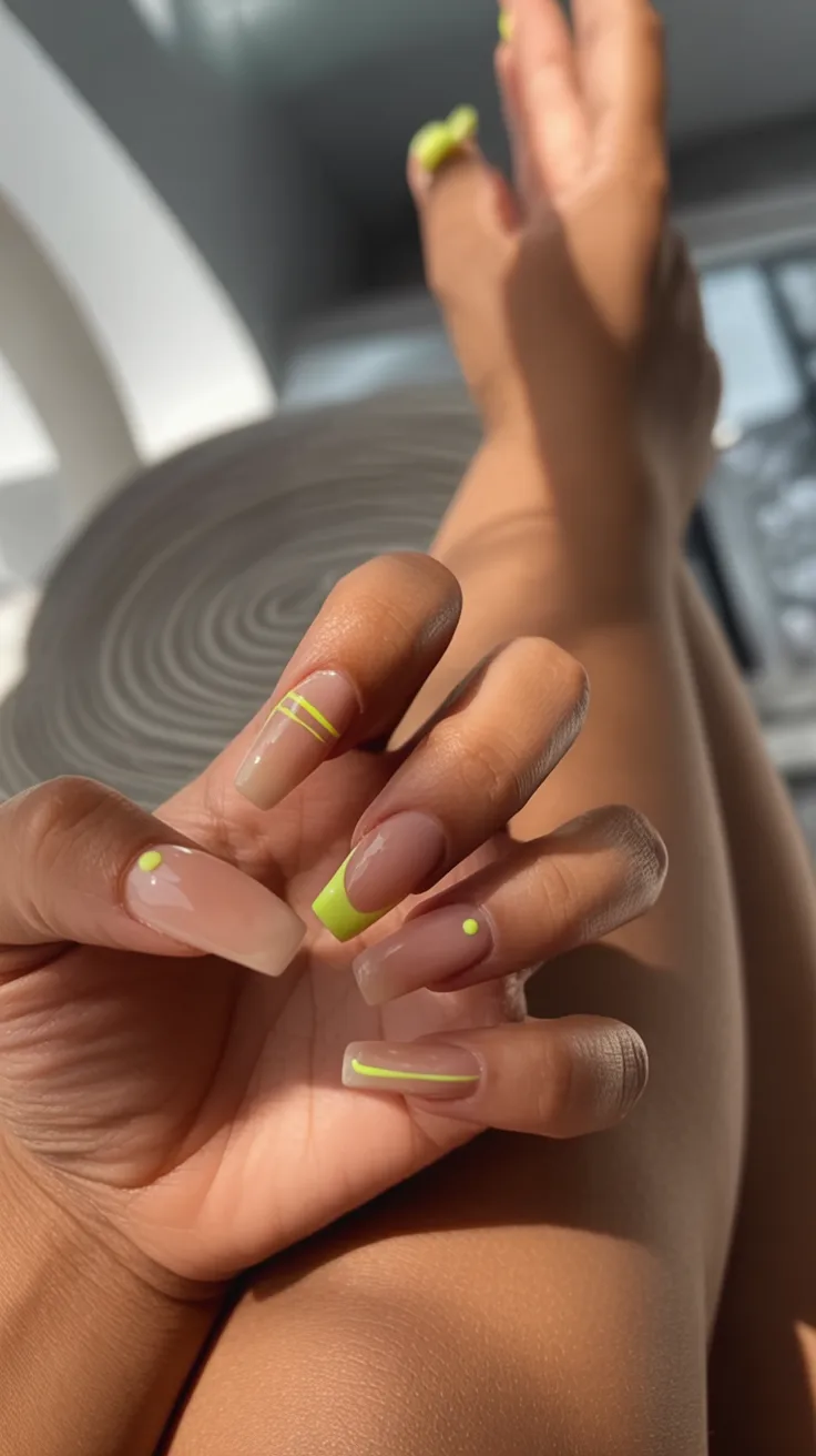 This neon Green detail over a sheer base feels modern, edgy, and very 2026. It’s minimal but striking—those crisp lines and tiny accents give the nails structure without overwhelming the look. It’s the kind of design that feels fresh, almost architectural, yet still totally wearable for spring and summer.