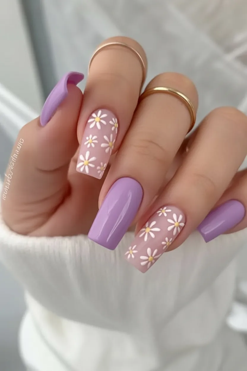 Lavender always feels a little magical in spring, doesn’t it? This soft purple paired with daisy accents creates a sweet but elevated mood. It’s playful, yes—but it also feels intentional and polished. The balance between the solid color and detailed designs keeps it from looking busy. These spring square nails 2026 feel like a fresh start wrapped in a soft pastel bow.