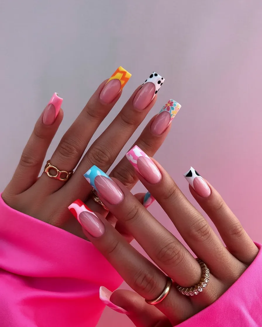 This playful mix of graphic tips feels straight out of a modern art gallery. Polka dots, florals, bold color blocks—every nail tells a slightly different story. It’s eclectic, stylish, and full of personality. Spring square nails 2026 are clearly embracing individuality, and this look proves it.