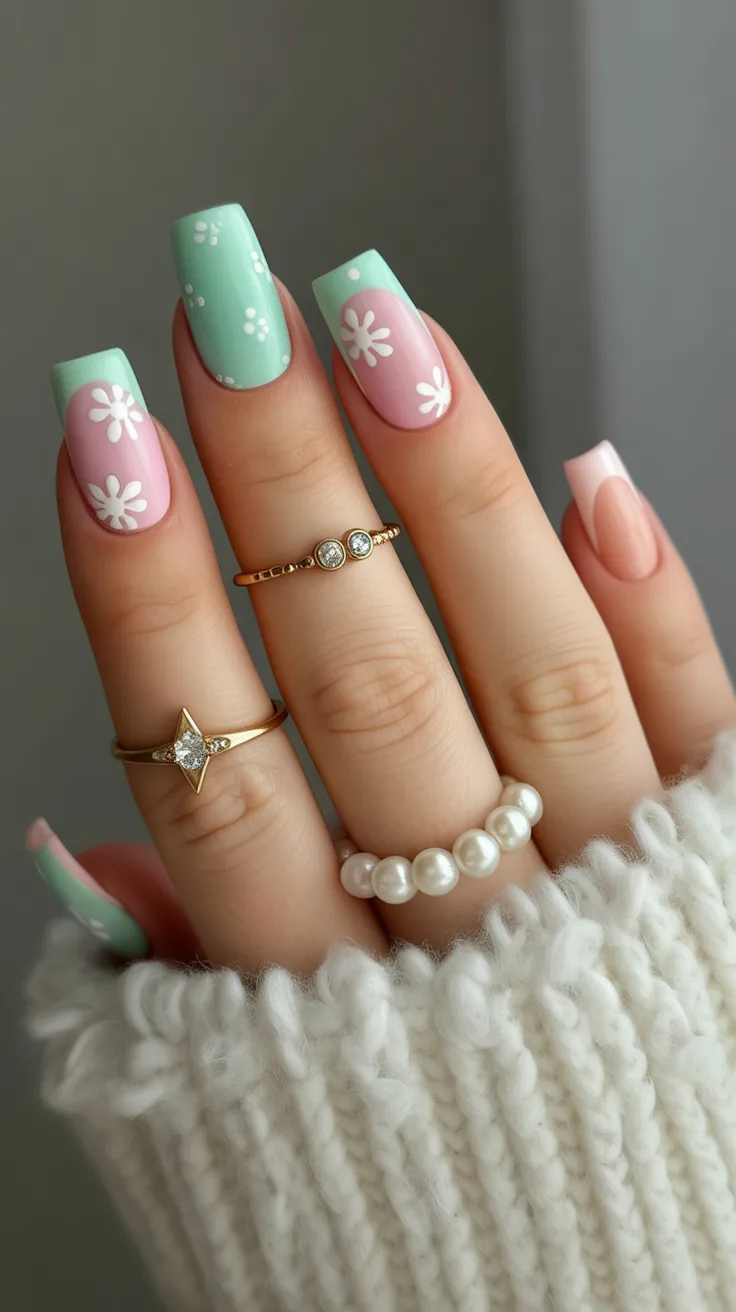 Mint Green and soft pink together feel like the ultimate spring duo. The daisy designs add charm without overwhelming the look, creating that sweet garden-party vibe. It’s light, optimistic, and undeniably Cute — everything we love about spring square nails 2026.