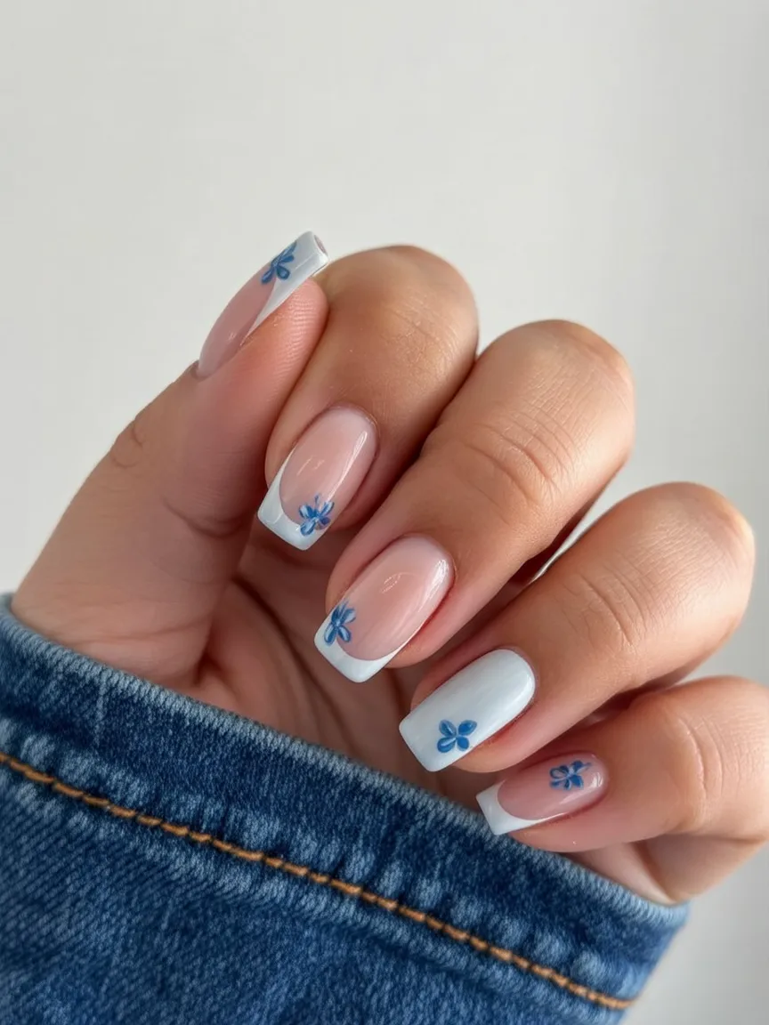 There’s something irresistibly fresh about blue paired with a crisp white French tip. Add tiny floral accents, and suddenly it feels like spring in full bloom. The soft nude base keeps it elegant, while the blue details add just the right touch of personality.