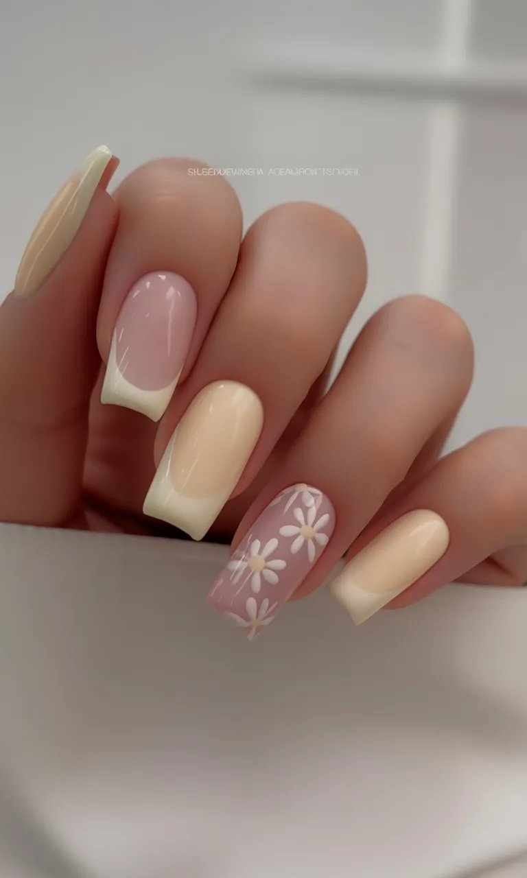 There’s a creamy, almost buttery softness to this vanilla-toned manicure that feels incredibly chic. The gentle French tips paired with daisy designs give it a romantic, fresh-from-the-garden energy. It’s delicate but not fragile. Think quiet luxury meets spring picnic. This is the kind of look that whispers confidence instead of shouting trends.