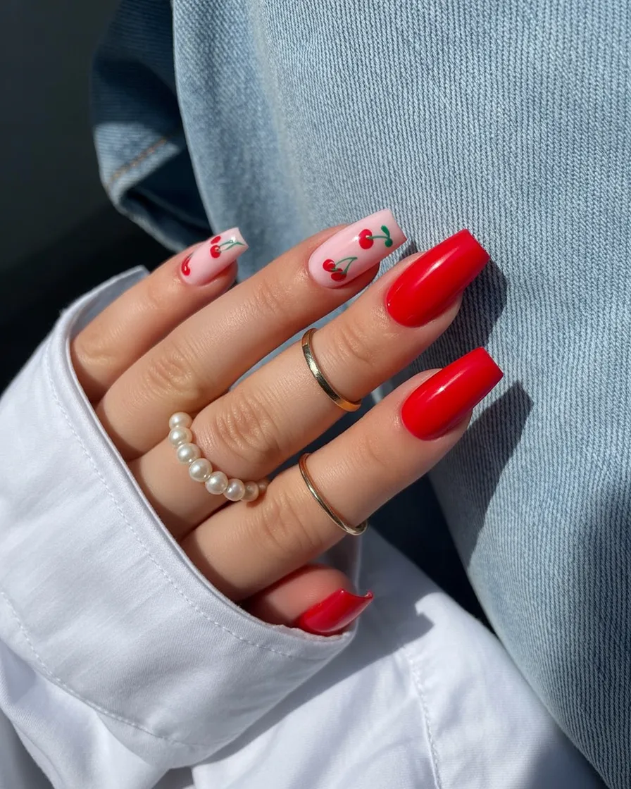 If you love long nails and statement colors, this is your go-to. The simplicity of the solid red keeps it versatile, while the cherry detail adds personality. It works beautifully for evenings out or everyday wear if you’re the type who loves a little drama.