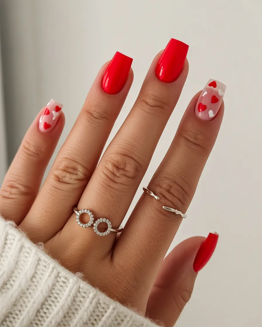 This look works beautifully on medium to long nails and flatters most skin tones. The contrast between the solid red and transparent heart designs creates depth without clutter. If you want something bold that still feels playful, this is a beautiful balance of simple and expressive.