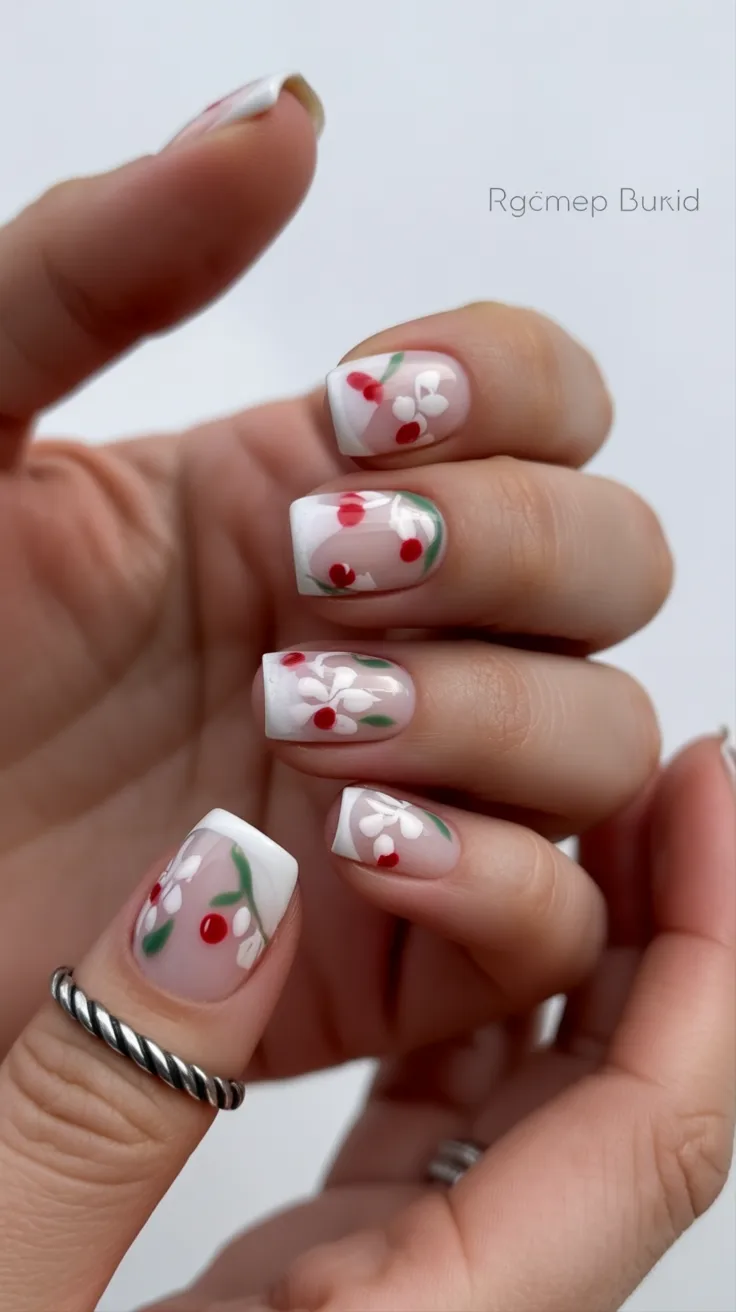 This softer cherry-inspired design feels lighter and more romantic than the bold red version. The semi-sheer base with delicate white florals creates a fresh, airy effect that feels perfect for warmer days. It’s the kind of manicure that makes you want to book a weekend getaway or plan a picnic.
