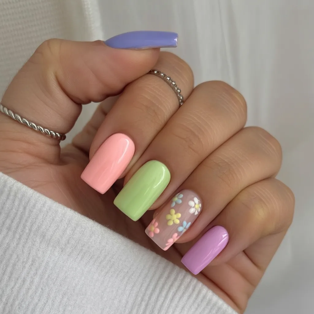 What makes this one special is its simplicity. No complicated designs, just clean color blocking in fresh spring tones. It works beautifully on long square nails and flatters both warm and neutral undertones. If you want simple 2026 ideas that still feel on-trend, this candy-inspired palette is an easy yes.