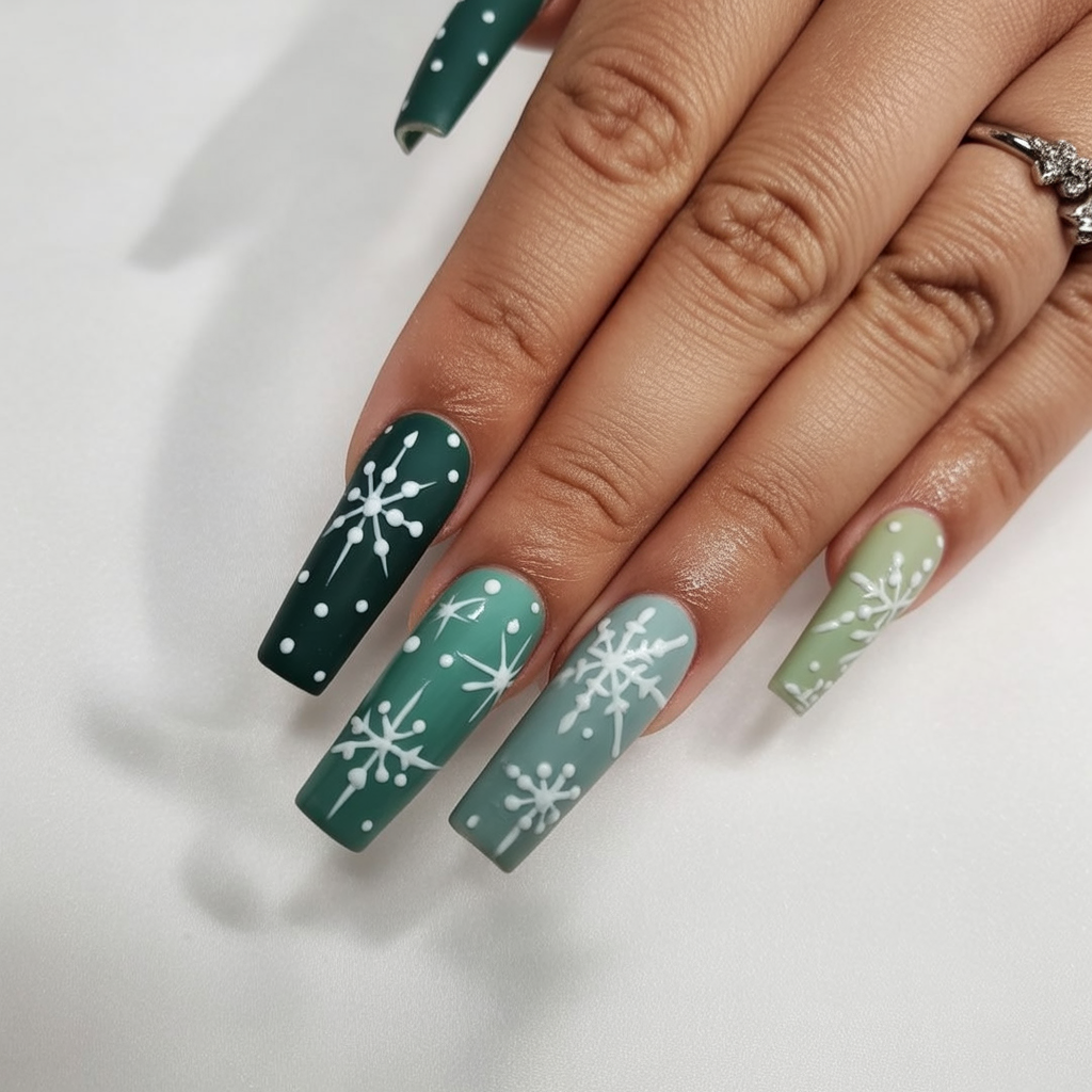 Soft gradients of sage, mint, and dark green make this set a fresh take on Christmas nails. Snowflakes scattered across each nail tie it together into a cozy winter design that feels modern and stylish. It’s understated yet festive, making it a subtle nod to the season.
