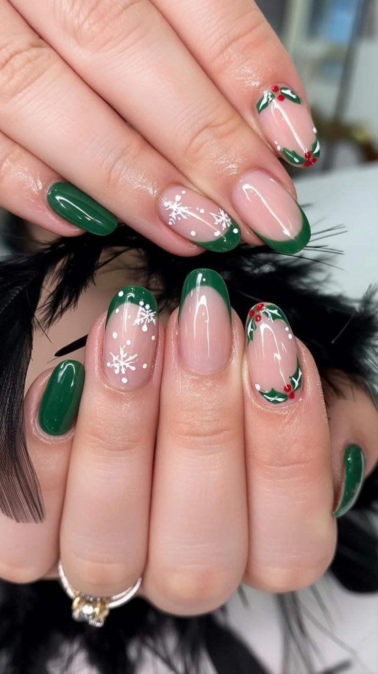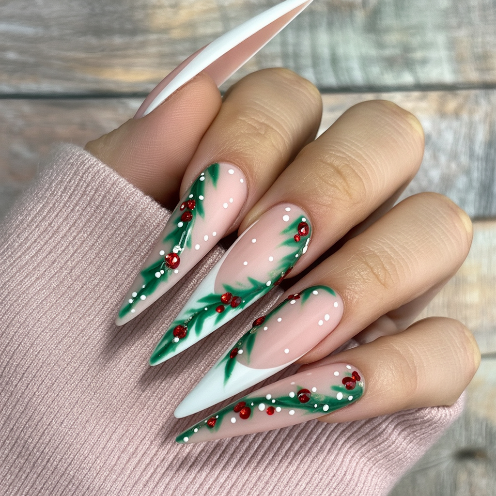 There is something quite magical about this concoction of green french tips, delicate snowflakes, and holly berry details. The look captures spirit of the holidays with just the right amount of whimsy, so to speak, as if the manicure had been sprinkled with Christmas charm. It keeps the fun without going over the top, great for those who want to keep it classy while giving a wink to tradition.