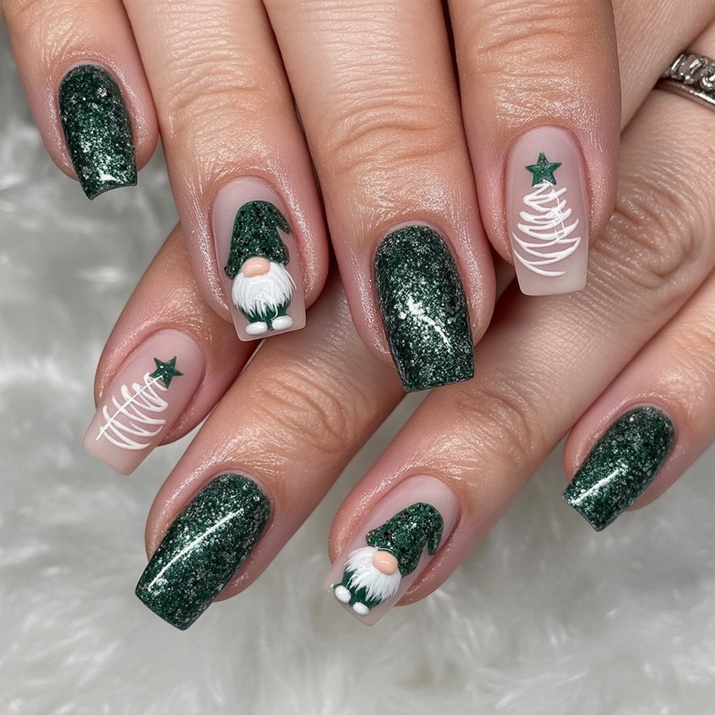 Nothing is cute like tiny holiday gnomes paired with sparkly-green nails. The look is whimsical and light-hearted; you can almost hear your nails whispering a little holiday story. Forest glitter makes it festive, and the tree and gnome art add playful touches that seem to come right out of a Christmas fairytale.