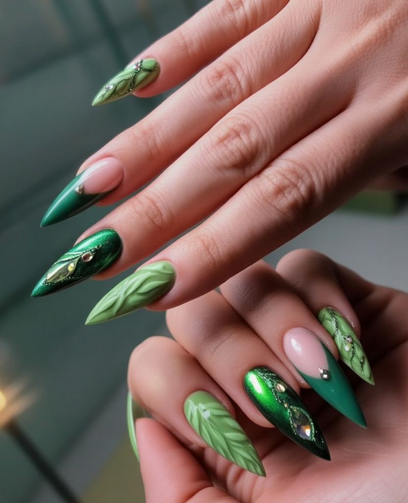 These fabulous nails blend the dreamy vibes of light and darker greens, with a dash of gems for sparkle. The textures vary-from glossy to matte and even embossed-to make them feel like miniature pieces of art. They’re glamour, with a tinge of playfulness; the kind that lifts your spirits instantaneously.