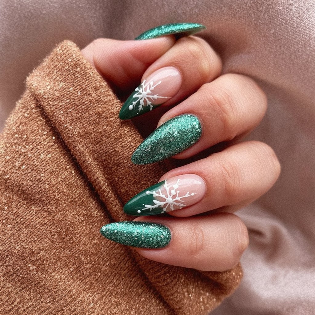 Sparkly emerald green nails never go out of style, and adding white snowflakes makes them feel like a fresh winter’s night. This design is classy yet festive, the kind of look that takes you from casual gatherings to elegant parties with ease.