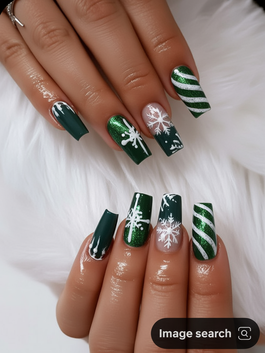 Bold, playful, and full of holiday cheer, these forest green nails with snowflakes and striped accents are pure fun. The combination feels like a mix between classic wrapping paper and a snowy wonderland, giving your manicure an upbeat vibe. This is one of those designs that make you smile every time you look down at your hands.