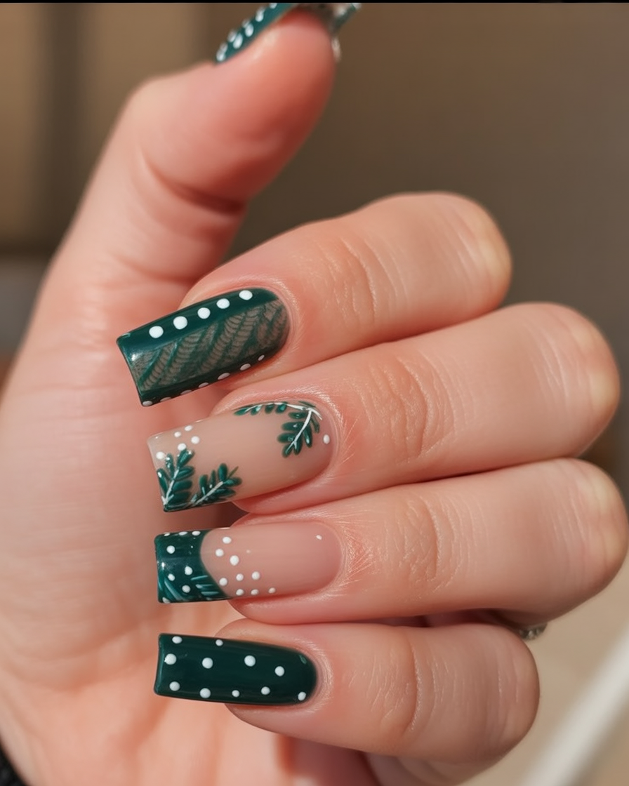 These evergreen square nails are dotted with snowy white details and delicate leaf art. The combination feels cozy, like walking through a snowy forest on Christmas Eve. The mix of glossy green and nude bases makes the whole look stand out while still staying balanced.