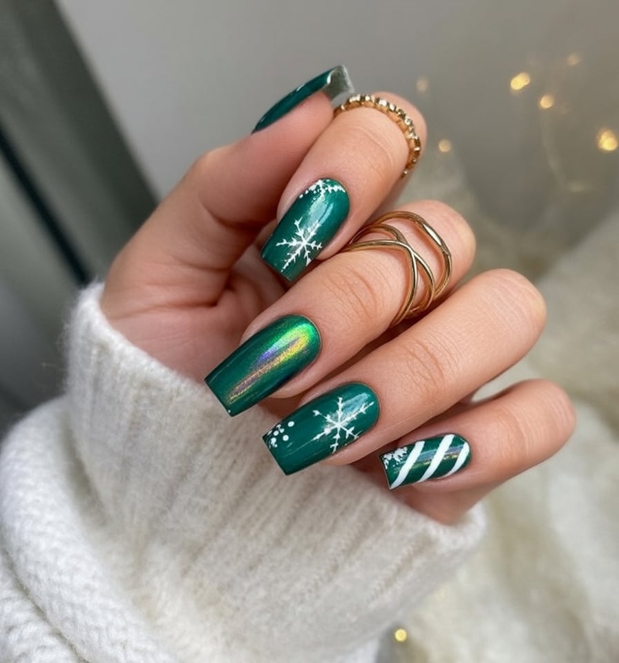 For a style that leans into a mix of cool and festive, chrome green nails with snowflakes and candy cane stripes are the perfect inspo. The chrome finish brings in a shine from across the future, while the holiday detail makes sure it stays fun and festive. It’s a bold look still given to be classy.
