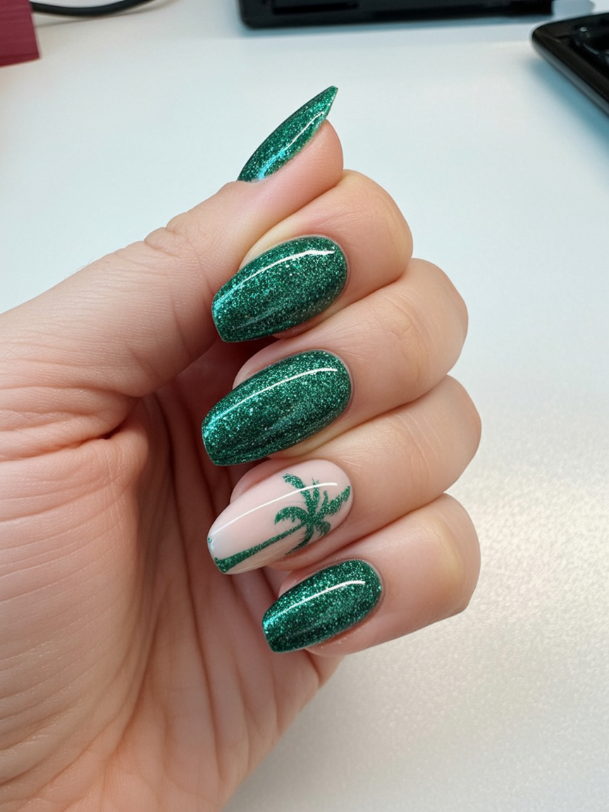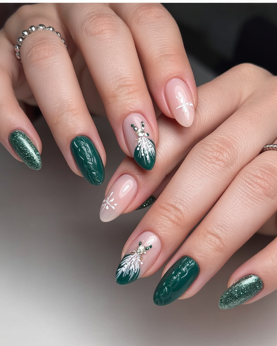 This manicure sparkles with emerald glitter on most nails while a playful palm-like accent keeps things unique. It’s an original take on green Christmas nails for 2025, infusing a little holiday sparkle yet remaining fresh and cutting edge. The shimmer hits the light just right, ensuring the hands are being noticed anywhere you go.