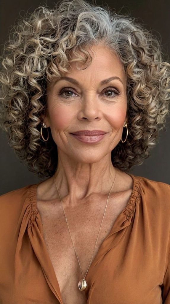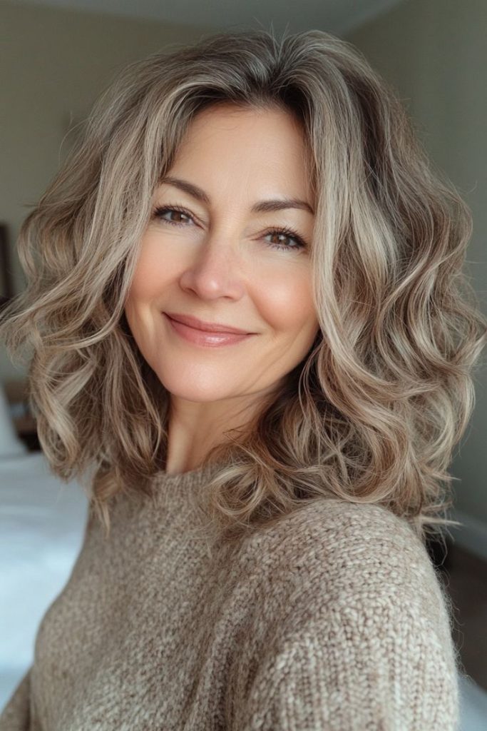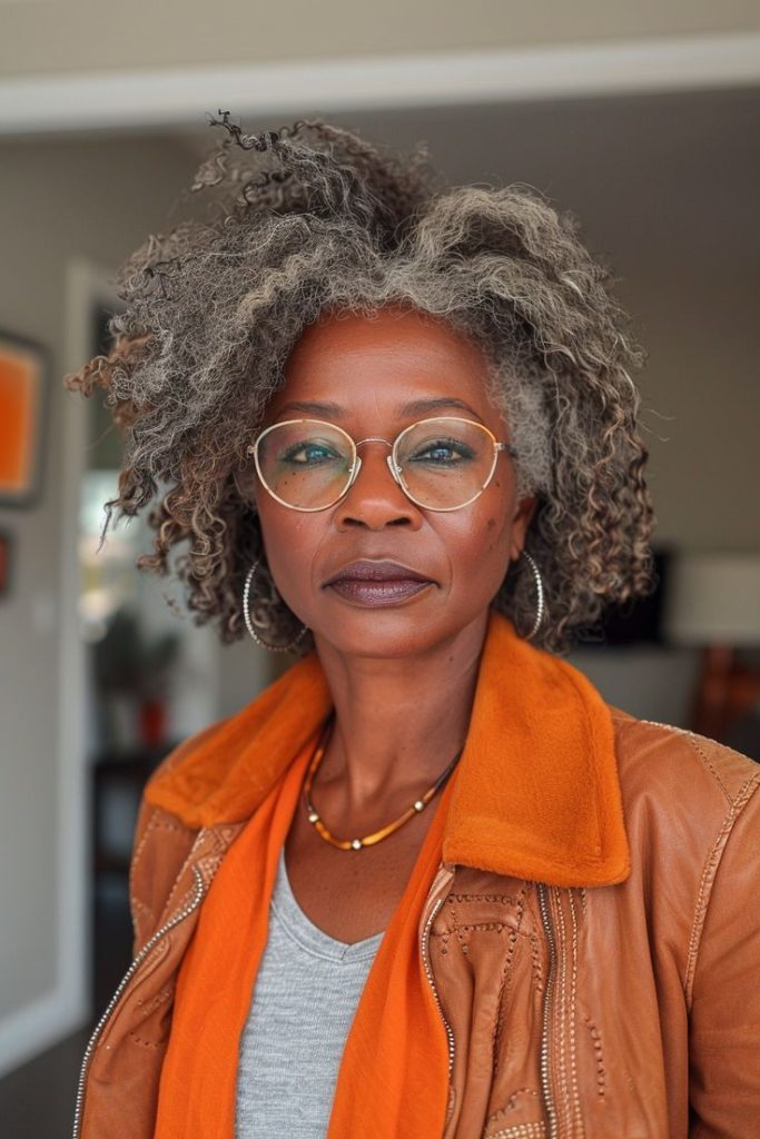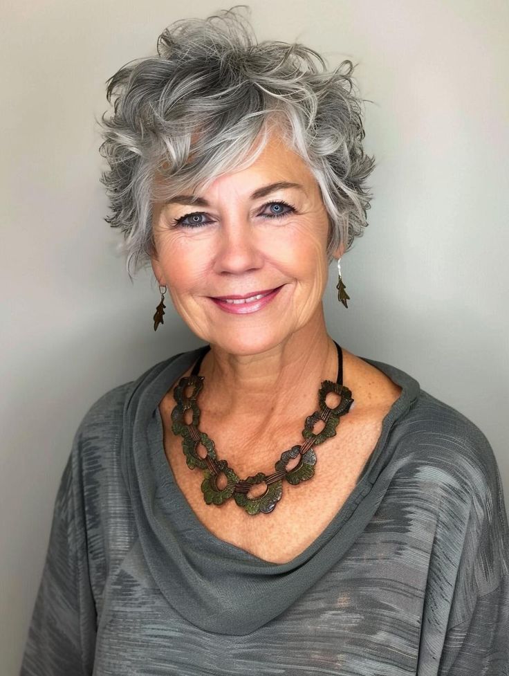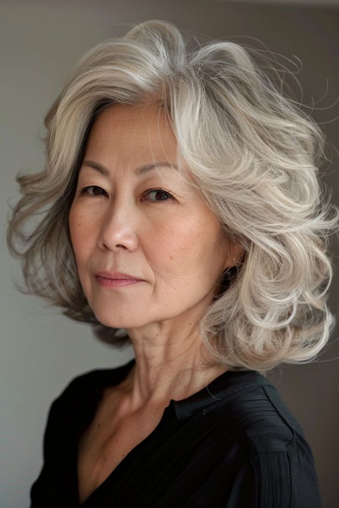 Gray hair takes center stage in this fabulous look, featuring loose, textured curls that exude natural charm. This style is particularly flattering for women with medium wavy or thick hair, creating a soft, voluminous effect. The gentle layers frame the face beautifully, making it suitable for various occasions, from casual brunches to evening soirees.