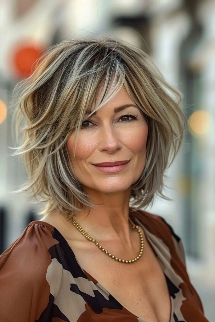 A layered bob with highlights is a modern and chic choice for 2025. This chin length style features soft layers that enhance movement, while the highlights add dimension and brightness. It’s perfect for women with thick hair or those looking to add depth to their hairstyle.