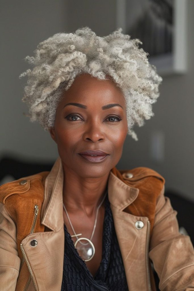 To maintain this look, apply a leave-in conditioner and style with a pick comb to shape the afro. The silver highlights add depth and dimension, making this hairstyle a true statement piece.