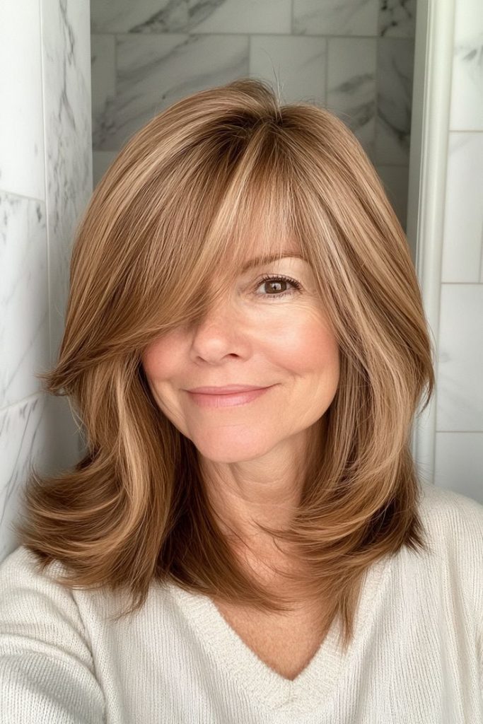 For those who prefer a bit more hair length, feathered layers at shoulder length offer the perfect blend of sophistication and manageability. This cut is ideal for fine hair, providing movement and a youthful bounce. It’s a versatile option, pairing seamlessly with both casual wear and formal attire.