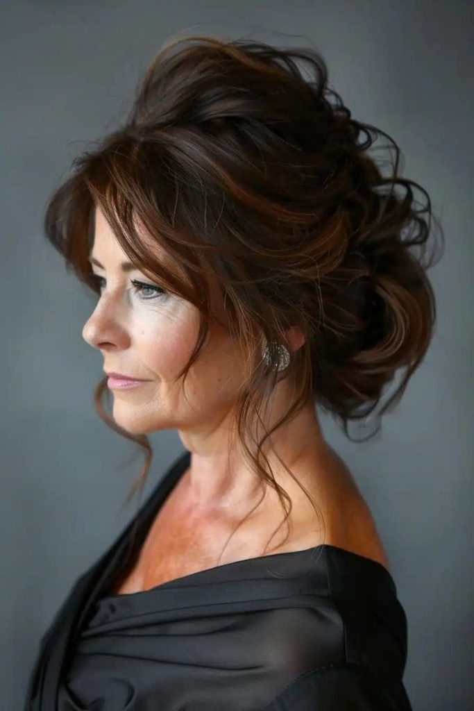 An elegant updo is perfect for special occasions or formal events. This hairstyle elevates any look with its voluminous crown and softly curled strands framing the face. Women with medium length or long hair can easily pull off this sophisticated style.