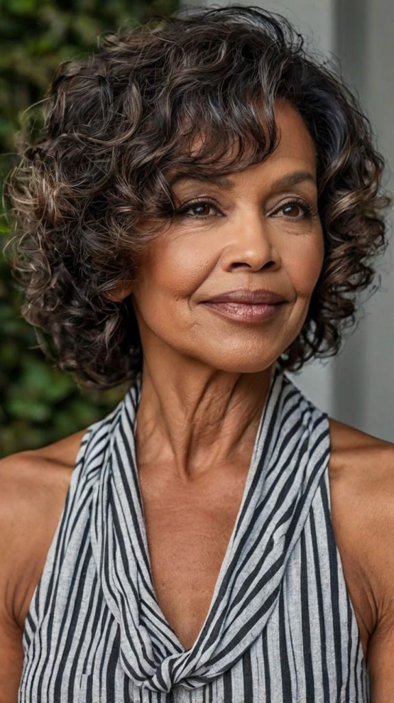 A short bob paired with defined curls brings an air of youthful vibrance. This style is perfect for women with curly hair or those willing to use hot rollers to achieve the look. The cut’s chin length frames the face beautifully, making it a great option for oval and round face shapes.