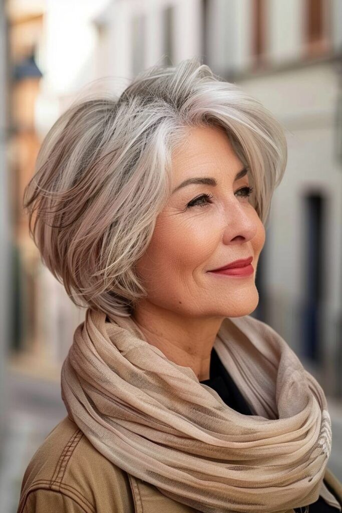 A layered gray bob is an effortlessly chic choice for 2025. This short bob style features soft layers that add volume and movement, making it perfect for women with fine hair. The cut beautifully accentuates the natural gray tones, adding a sense of elegance and maturity.
