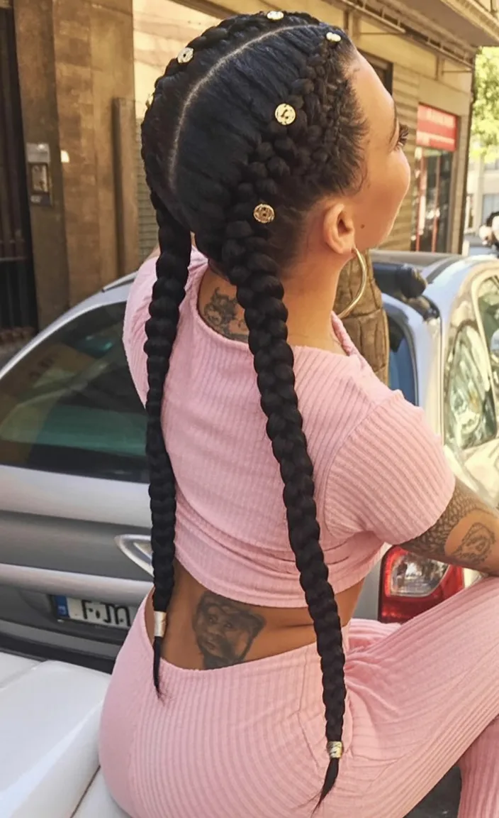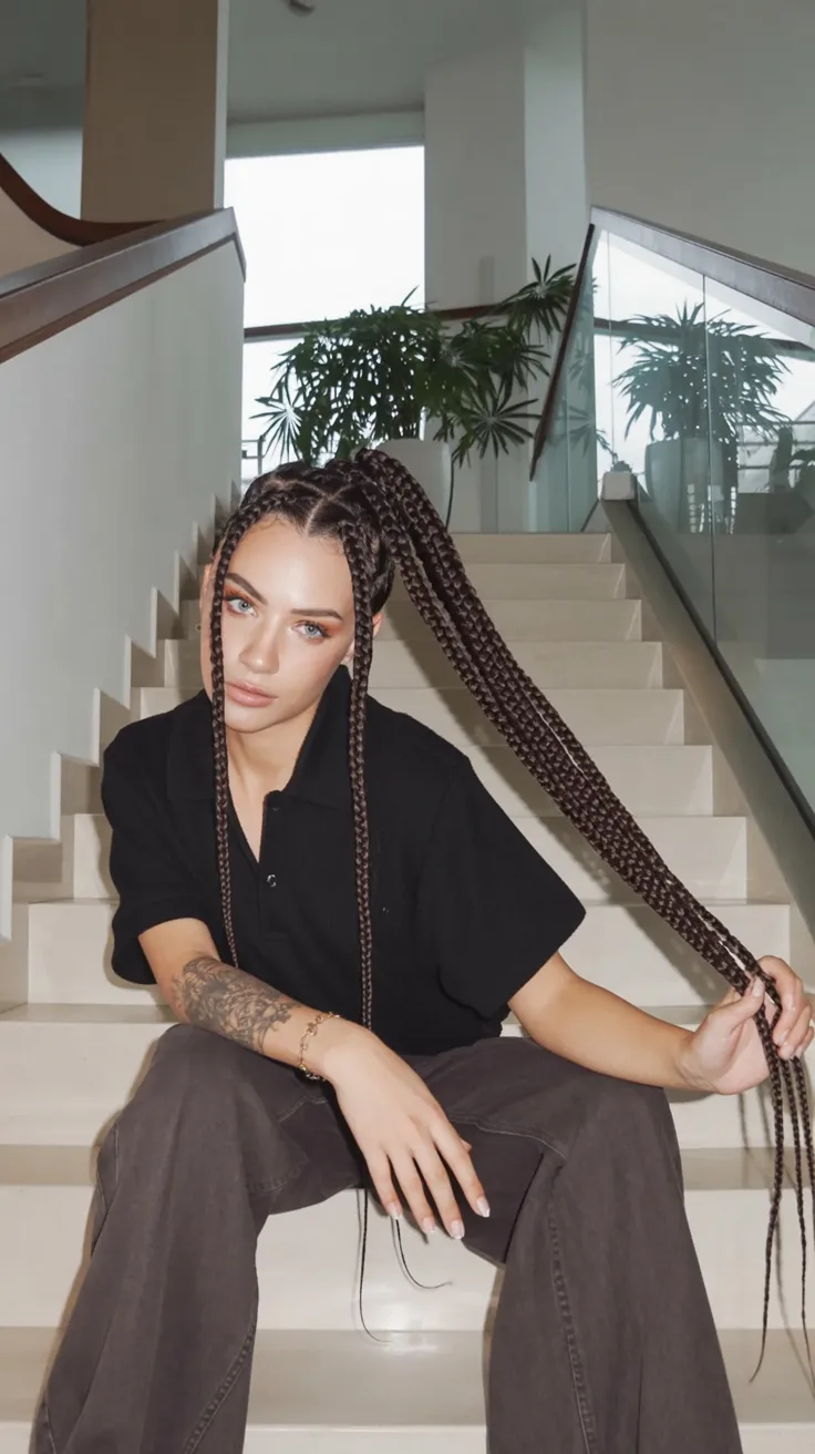 This hairstyle has real presence. The long, thick braids create such a strong silhouette, but the little metallic accents woven through the top give it that extra flash that makes the whole look feel styled rather than simply practical. It is bold, sleek, and full of attitude in the best way. There is something so satisfying about a braid look that feels powerful from every angle, and this one absolutely does. The clean parting keeps everything sharp, while the extended length brings drama and movement. It has that confident, city-ready mood that turns a simple matching set or casual outfit into something cooler, sharper, and much more memorable.