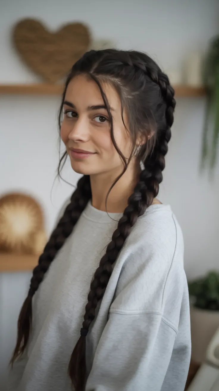 This is a great braid option for women who want something secure, flattering, and easy to wear through a full day. It suits medium to long Hair, especially textures with a bit of grip, though smoothing cream can help finer strands hold better too. For School, travel days, errands, or low-key weekends, it is practical without feeling plain. The extra face-framing braids also give it a slightly more modern attitude than standard double braids, which makes it a nice choice if you want something familiar but fresher. Try it now if you are in the mood for braid ideas that feel effortless yet still clearly styled.