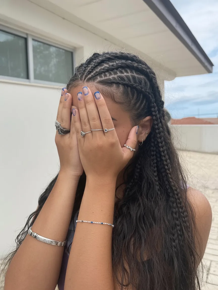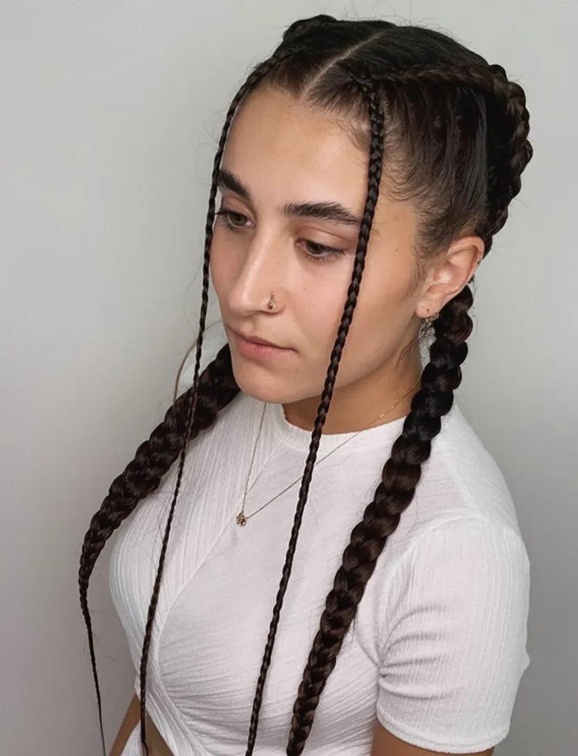 This look takes a familiar braid style and gives it a little more personality. The two fuller braids keep the hairstyle grounded and classic, but those long, slim face-framing braids in front add a cool, slightly unexpected finish that changes the whole mood. Suddenly it feels less basic and more styled, like you took a simple idea and made it your own. There is a confidence to that. The center part keeps things balanced, the braids create a strong silhouette, and the loose pieces at the front soften the face just enough. It is casual, but it still has presence, which is exactly why it works so well.
