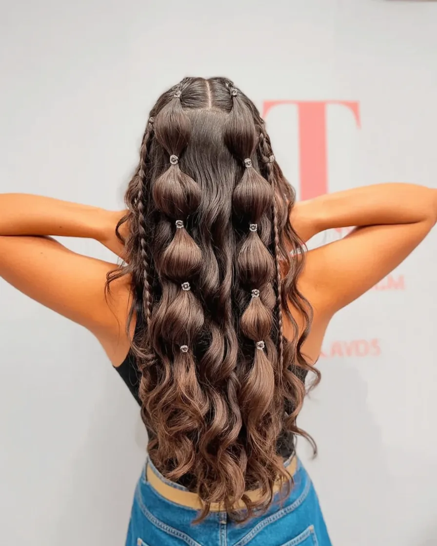This hairstyle feels playful in such a modern way. The bubble sections bring in that fun, almost editorial texture, while the loose wavy ends keep everything soft and wearable. From the back, it has so much personality without looking overworked, which is why styles like this tend to get all the compliments. It is youthful but still polished. It feels a little unexpected, too, and that is part of the charm. Instead of relying on one braid or one ponytail, it builds visual interest through repetition and shape. The result is a look that feels cheerful, pretty, and full of movement, like the hair version of having a really good mood.