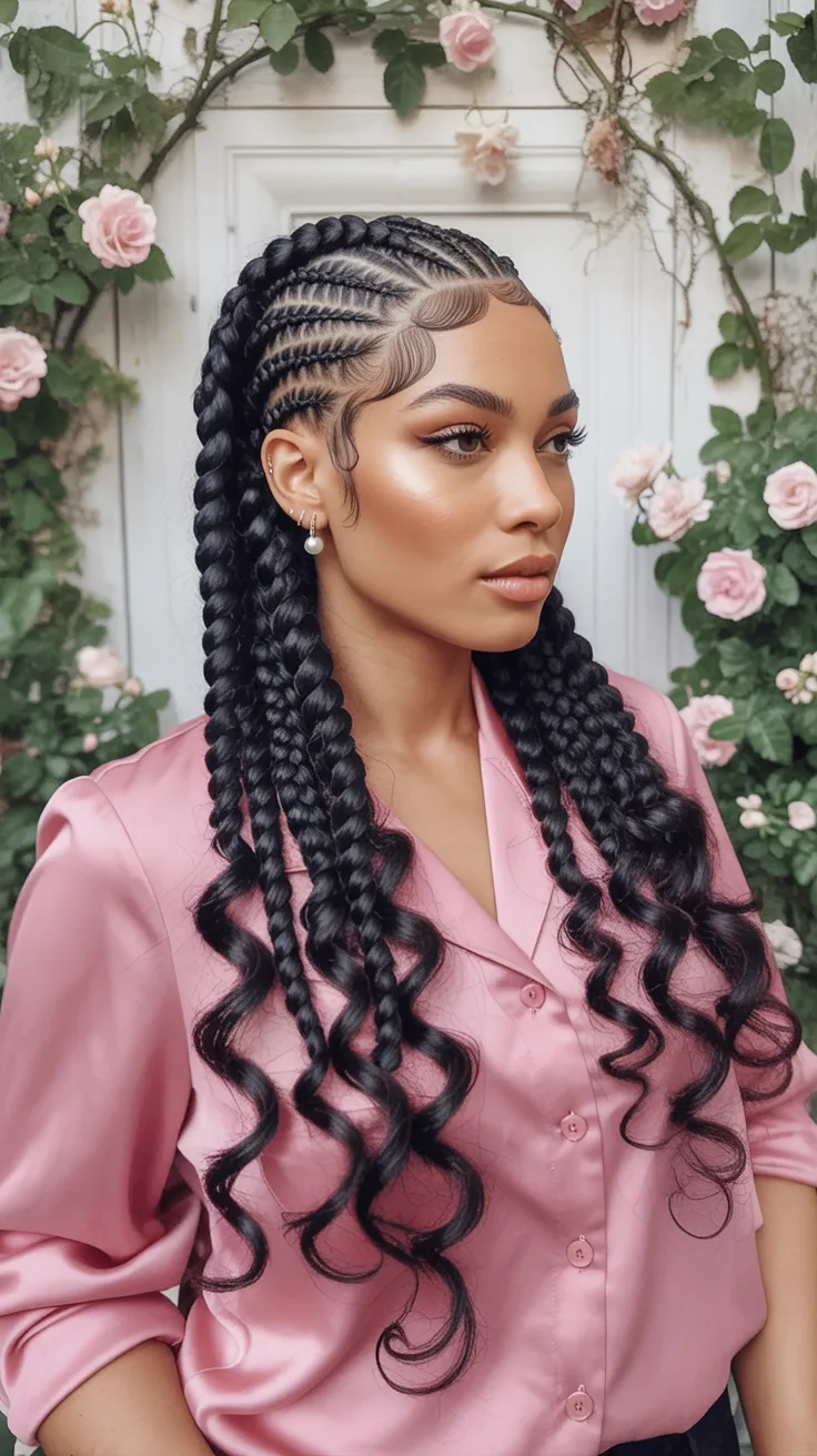 This look is pure presence. The braiding is sleek and sculpted close to the scalp, then the ends fall into glossy curls that soften everything in the prettiest way. It feels elegant, intentional, and beautifully balanced, like strength and softness living in the same hairstyle. The polished baby hairs and the clean braid direction give it a luxurious finish, while the curled lengths keep it from feeling too strict. It is the kind of look that makes even a simple outfit feel elevated. There is a quiet glamour here that would be stunning for a celebration, but it is also confident enough to stand on its own any day you want your Hair to say something before you do.