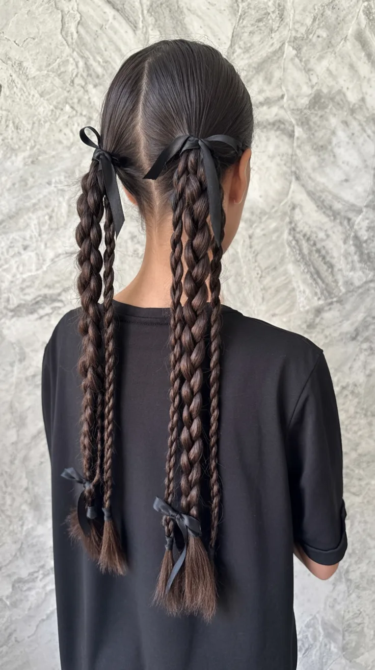 This is such a Cute option for kids, teens, or adults who love a clean braid look with a little extra detail. It works best on long hair or at least medium lengths that can hold multiple plaits neatly, and the ribbons are a lovely alternative to a Bow clip because they feel woven into the style. For school mornings, dance events, or casual gatherings, this can be surprisingly practical once you get the parting right. A smoothing gel and a tail comb are your best friends here, especially if you want that polished finish. Wear it with a sleek top, minimal makeup, and small earrings, and the whole look feels intentional instead of overly sweet.