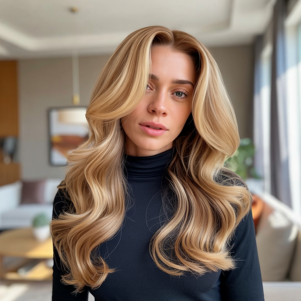 This honey blonde cascade is pure attitude—bold, untamed, and effortlessly sensual. The combination of tousled waves and rich golden undertones is really the confidence that says, “I woke up like this,” and doesn’t need any perfection to back it up. Add one swipe of red lipstick, and it becomes a full statement moment in itself.
