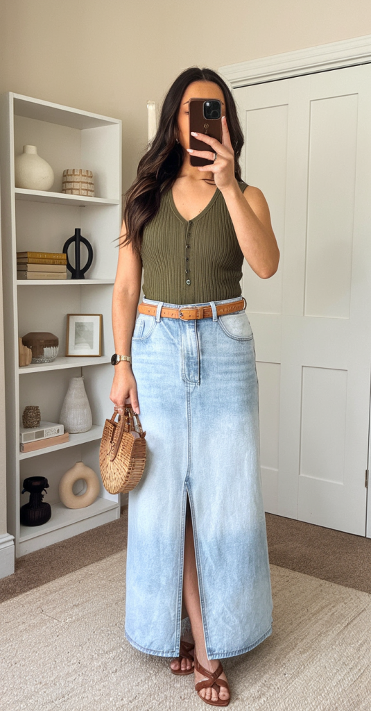 A long blue high-waisted denim skirt with a front slit offers an airy, comfortable feel for summer. Paired with an olive green ribbed crop top and a tan leather belt, this outfit balances structure and flow effortlessly. The woven bag and brown sandals reinforce the boho-chic aesthetic, making it a perfect weekend outfit.