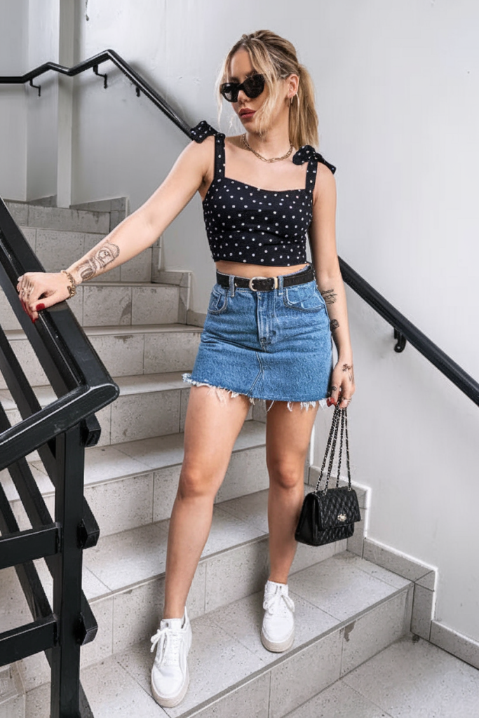 A mini denim skirt styled with a black polka-dot crop top and chunky sneakers makes for the ultimate casual city outfit. The raw-hem skirt adds a rebellious edge, while a black belt and sunglasses keep it polished. This look is perfect for running errands or hanging out with friends.