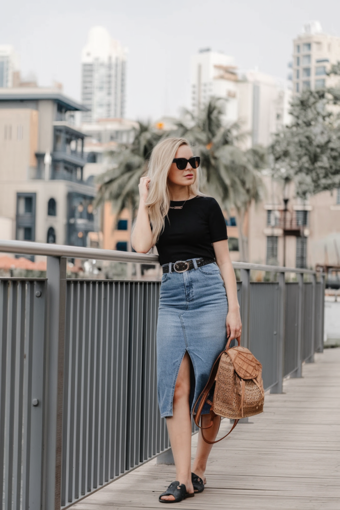 A midi denim skirt with a structured front slit meets a classic black fitted top in this elevated urban look. The sleek black sandals and woven brown backpack add a functional yet stylish edge, making it ideal for city walks or casual office wear.