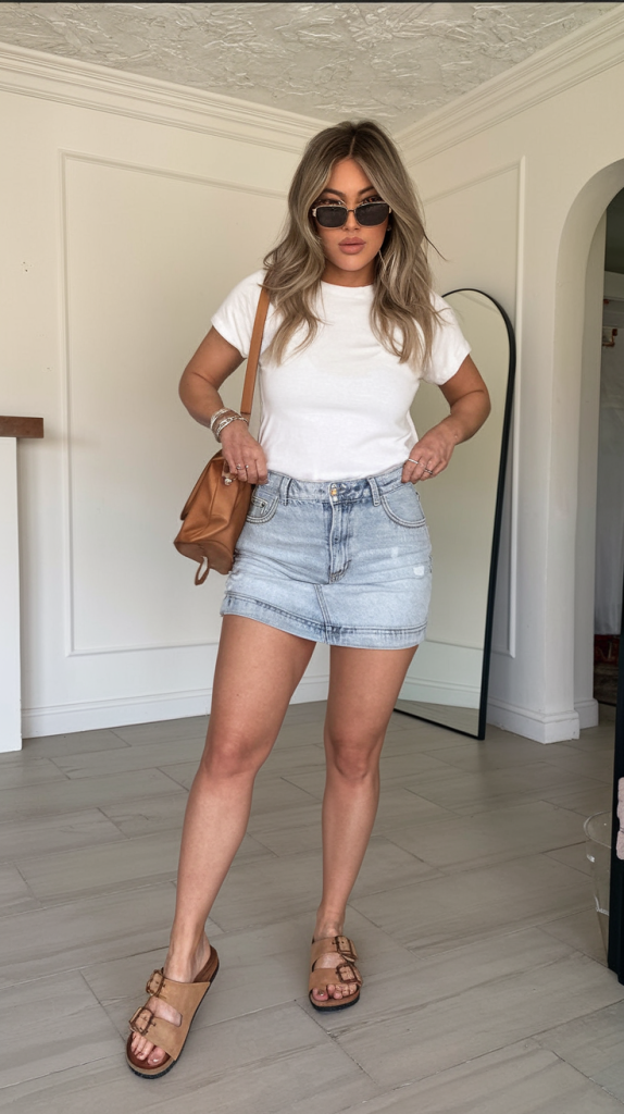 For those who love effortless dressing, this light-wash mini denim skirt with a classic white tee is an unbeatable combination. The neutral light brown sandals and bag bring warmth to the outfit, making it an excellent choice for running errands or catching up with friends at an outdoor café.