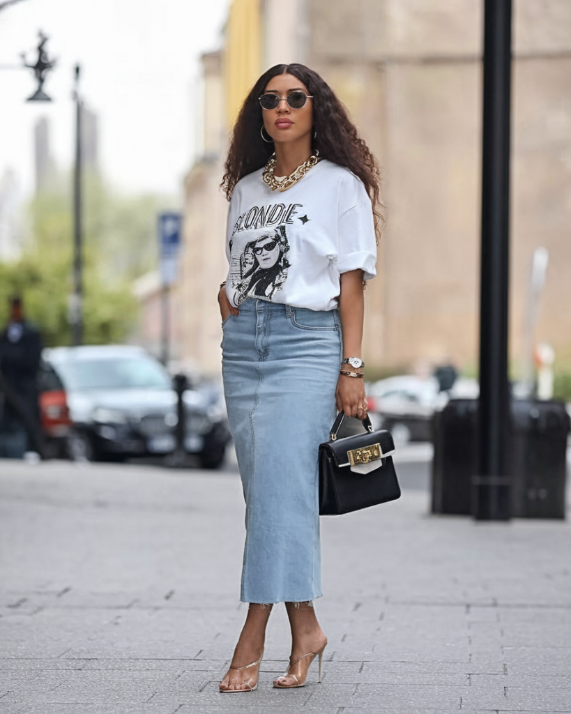 Long denim skirts are making a statement in 2025, and this long blue denim skirt with a raw hem is no exception. Paired with an oversized graphic tee, gold chain accessories, and transparent heels, this outfit exudes downtown aesthetic. The slightly slouchy fit of the shirt adds to the effortless vibe, while bold accessories give it a high-fashion touch.
