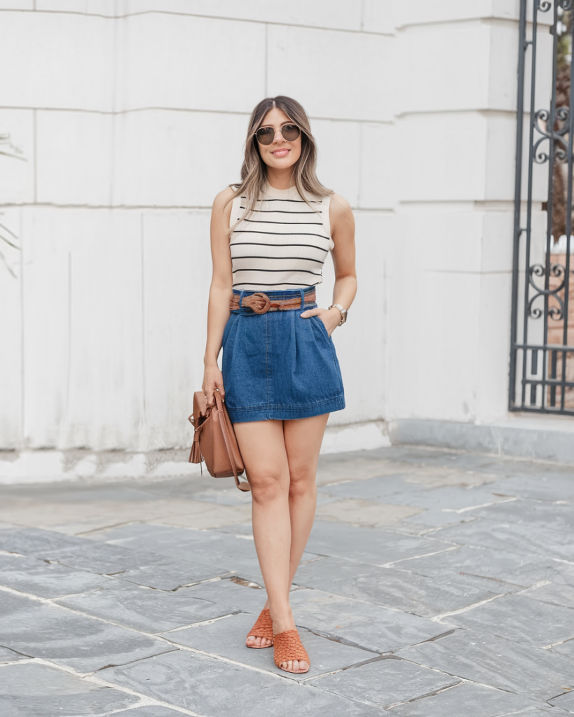 A striped sleeveless top and a dark denim skirt come together effortlessly to create a nautical-inspired summer look. The tan belt adds warmth, while woven sandals and a brown handbag complement the outfit’s earthy tones. This combination is ideal for weekend brunches or relaxed summer outings.