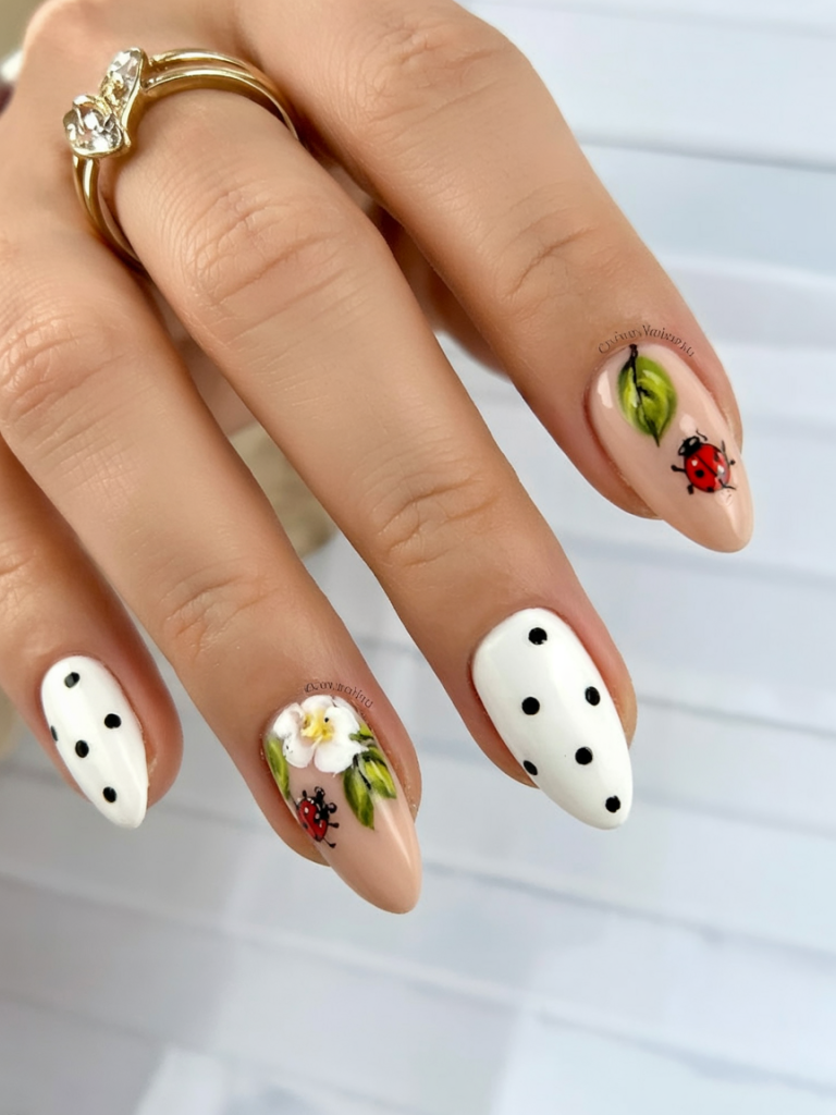 This cute and playful design blends creamy whites, dotted accents, and intricately hand-painted ladybugs nestled among green leaves and a single blooming flower. It embodies a carefree, garden party feel, perfect for anyone seeking ideas simple yet elevated. The almond shape here is chic and practical, adding elegance to the cheerful motifs. This one fits right into ideas 2025 almond and works beautifully for outdoor June gatherings or brunch with friends.