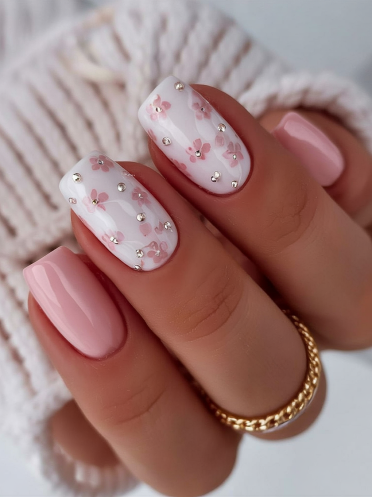 Blush pink and soft whites come together with subtle rhinestone accents and petite floral motifs. This design is tailor-made for wedding, bride, or formal occasions. The shape leans toward square, and the finish is ultra-glossy. Elegant and delicate, this is the ultimate romantic ideas 2025 look.