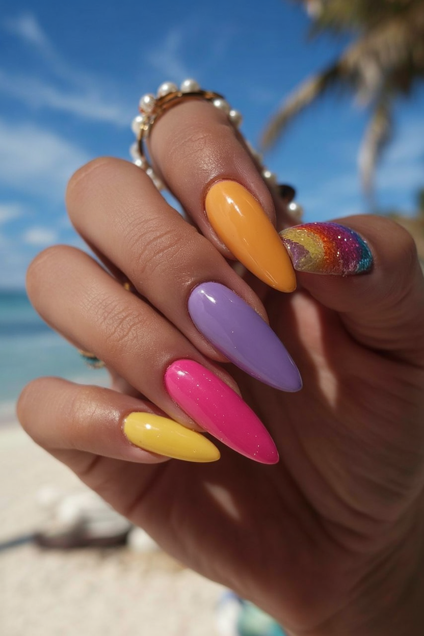 This joyful splash of rainbow shades is your go-to beach manicure for June. From glossy orange, lavender, hot pink, and sunshine yellow to a full glittery rainbow on the thumb, this manicure screams cute and confident. The elongated almond shape is totally in line with ideas 2025 almond, ideal for sun-drenched vacations or simply chasing that beachy state of mind. The gradient vibes are playful, yet the execution is pure 2025 trends glam.